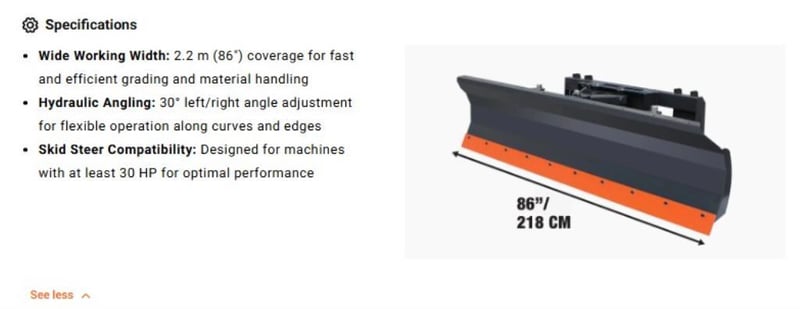 Designed with a reinforced A-frame and pivot mechanism, the DB86 delivers smooth, responsive directional control, enabling operators to effectively manage material along curves and uneven surfaces. Its bolt-on replaceable steel cutting edge ensures sharp, durable cutting power, even in rough ground conditions. Adjustable skid shoes provide height flexibility while protecting your machine from impacts and dead stops.