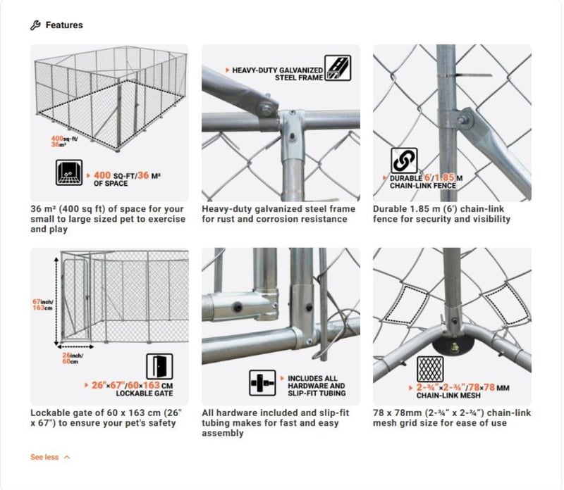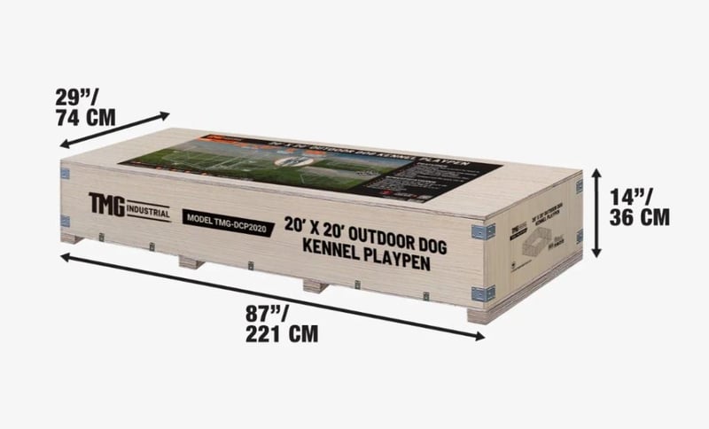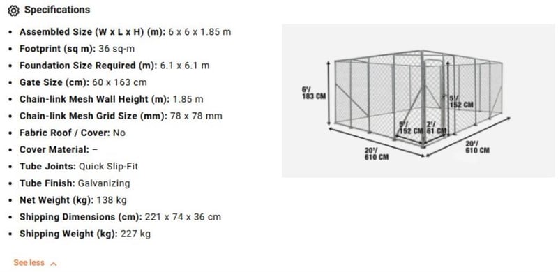 WAREHOUSE DIRECT** 6 x 6 m Outdoor Dog Kennel Playpen with Locking Gate, 1.85 m Chain-link Fence, TMG-DCP2020 "Product Description The TMG-DCP2020 Outdoor Dog Kennel offers a safe, spacious, and durable enclosure for your pets. Its 6 x 6 m (20' x 20') footprint provides approximately 36.0 m² (400 sq ft) of room for your dog to play and relax outdoors. Constructed from a robust galvanized steel frame, this kennel is built to last in the Australian climate. The included tarpaulin cover offers protection from the sun and rain, ensuring your pet is comfortable in all weather. A lockable gate provides peace of mind, knowing your pet is safe and secure. Easy to assemble, this kennel is a cost-effective and reliable solution for any pet owner."