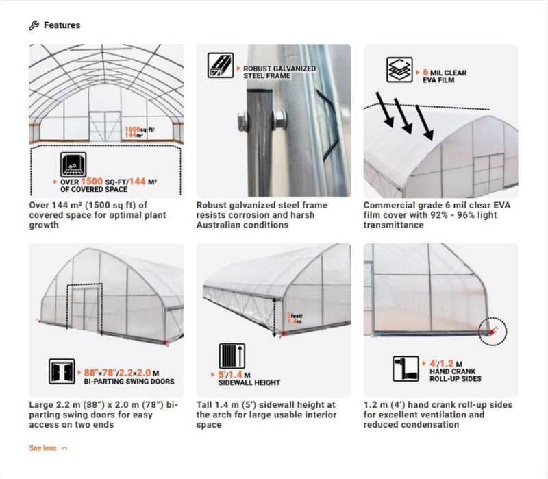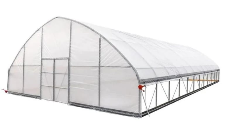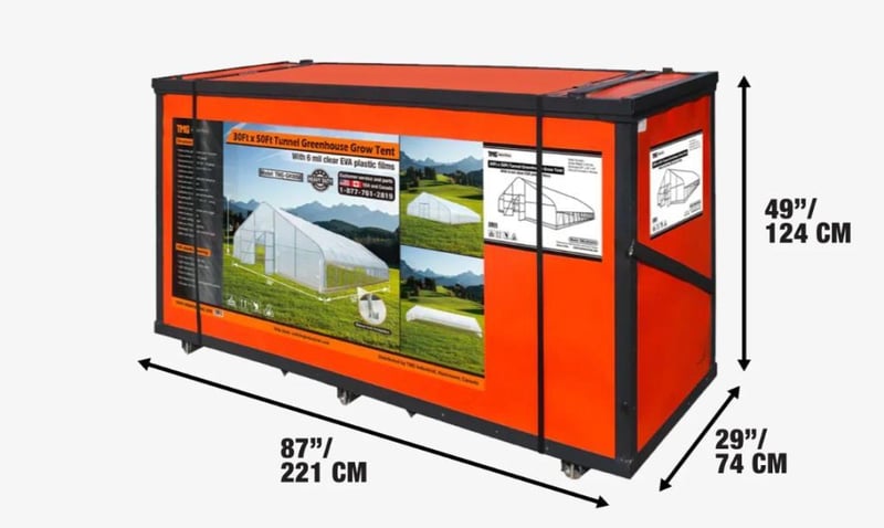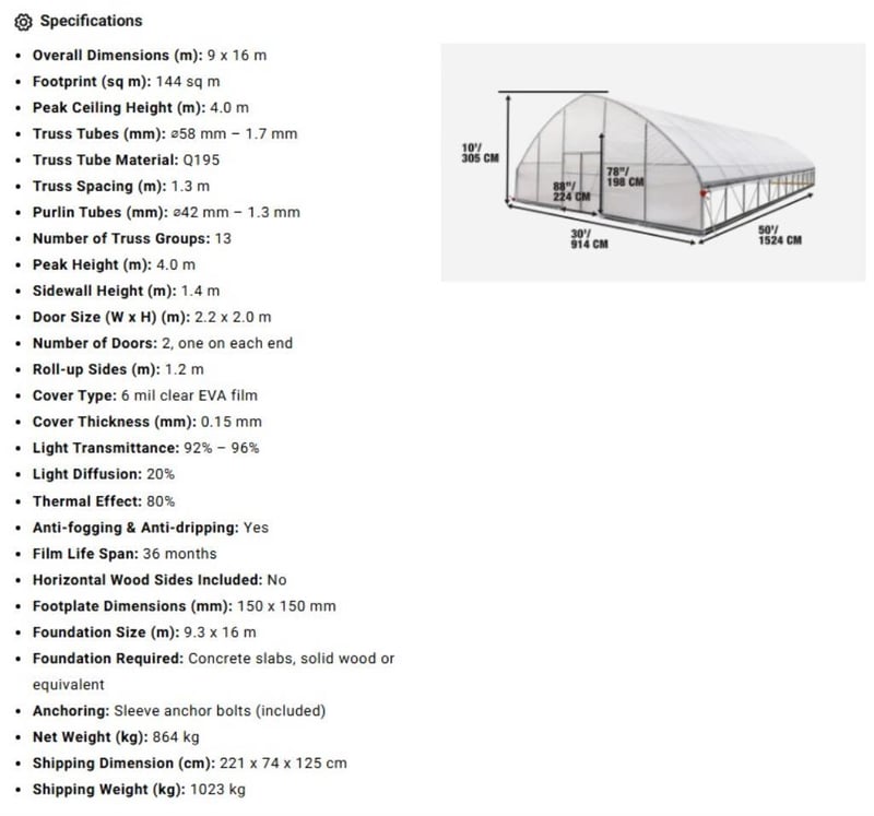 WAREHOUSE DIRECT** 9 x 16 m Commercial Tunnel Greenhouse with 6 Mil Clear EVA Film, Roll-Up Sides, TMG-GH3050 "Product Description The TMG-GH3050 Tunnel Greenhouse Grow Tent offers a sleek, professional, and efficient solution for growers across Australia. Its square 9 x 16 m (30' x 50') footprint provides over 144 square metres (1500 square feet) of sheltered space—ideal for growing a wide variety of plants, flowers, and vegetables year-round. This unit features a robust galvanized steel frame, creating a strong, stable, and long-lasting solution that offers reliable weather protection and durability against Australia's diverse conditions. The included 6 mil clear EVA plastic film cover is designed for optimal light transmission and diffusion, ensuring healthy plant development. Walk-through bi-parting doors on both ends allow for unparalleled access and workflow. "