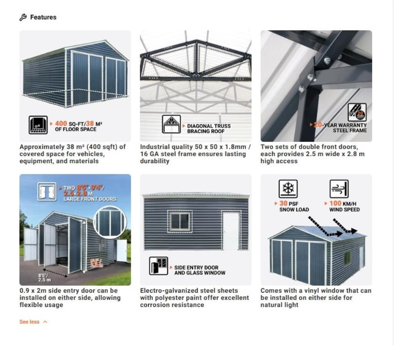This unit features a robust 50 x 50 x 1.8mm / 16 GA galvanized steel frame and 27 GA metal cover sheets, offering reliable weather protection. The large double front doors and a convenient side entry door allow for easy access, accommodating various equipment and vehicles. The sloped, vertical gable roof design enhances stability and helps prevent water build-up. Pre-drilled footplates with included sleeve anchor bolts make installation straightforward on a concrete base or equivalent. "