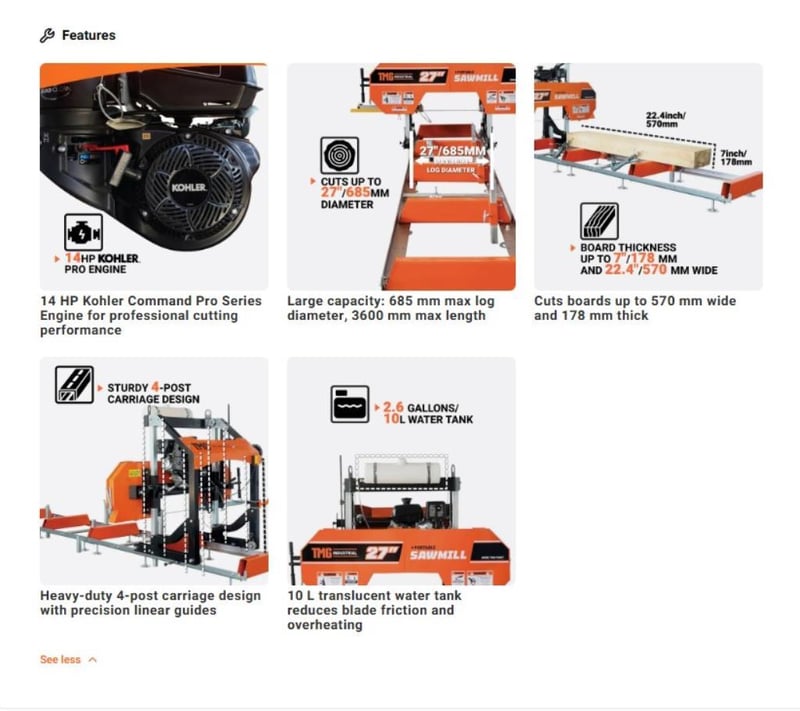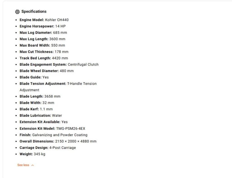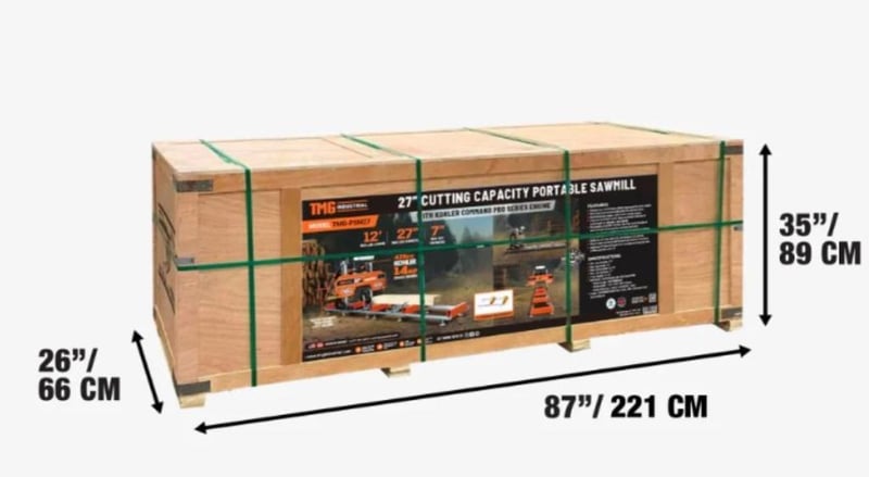 WAREHOUSE DIRECT** 3.6 m Portable Sawmill (Blade is not Included), 685 mm Diameter, 14 HP Kohler Engine, TMG-PSM27 "Product Description The TMG-PSM27 Portable Sawmill is built for those who demand more power, precision, and capacity in their timber processing work. With a high-output 14 HP Kohler engine and large-scale cutting ability, this sawmill is perfect for professionals, rural property owners, and serious DIYers in Australia. Able to handle logs up to 3.6 metres long and 690 mm in diameter, the TMG-PSM27 makes quick work of converting raw logs into clean, usable timber. The waist-height lift crank and solid carriage frame enhance ease-of-use and safety, while the water-cooling tank helps maintain blade condition. "