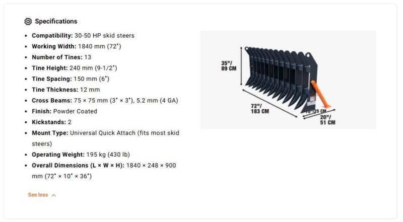 Equipped with universal quick attach mounting, the TMG-SDR72 easily fits most 30–50 HP skid steers. Its 150 mm (6″) tine spacing and reinforcing weld-on structure offer sifting efficiency and durability. Powder coating prevents corrosion, and dual kickstands allow upright storage between uses. "