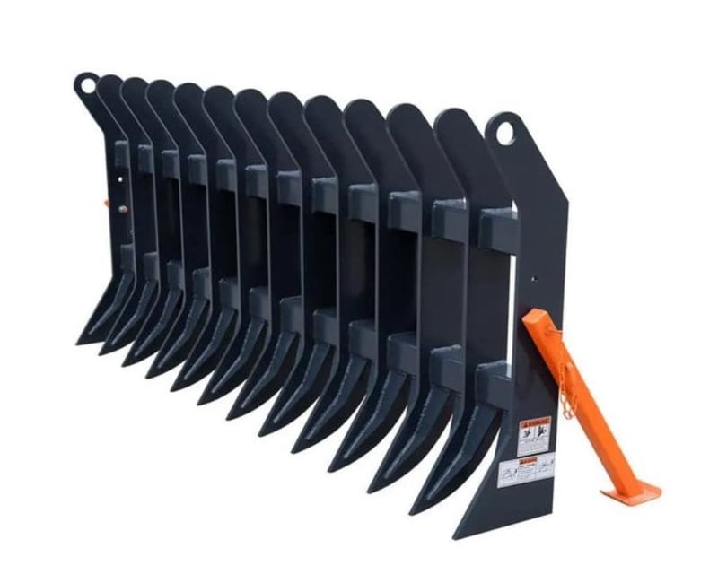 The TMG-SDR72 Root Debris Rake is a heavy-duty skid steer attachment engineered for professionals in land clearing, forestry, agriculture, construction, and recycling. With a wide 1840 mm (72″) rake head and 13 sturdy curved tines on robust 75 mmx 75 mm (3″ x 3″) crossbeams, it efficiently sweeps and picks up root debris, logs, brush, and other large materials while leaving the ground surface largely undisturbed.
