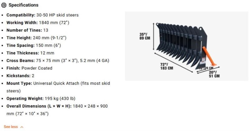 WAREHOUSE DIRECT**1840 mm (72″) Skid Steer Root Debris Rake Attachment, Universal Mount, 150 mm (6") Tine Spacing, TMG-SDR72