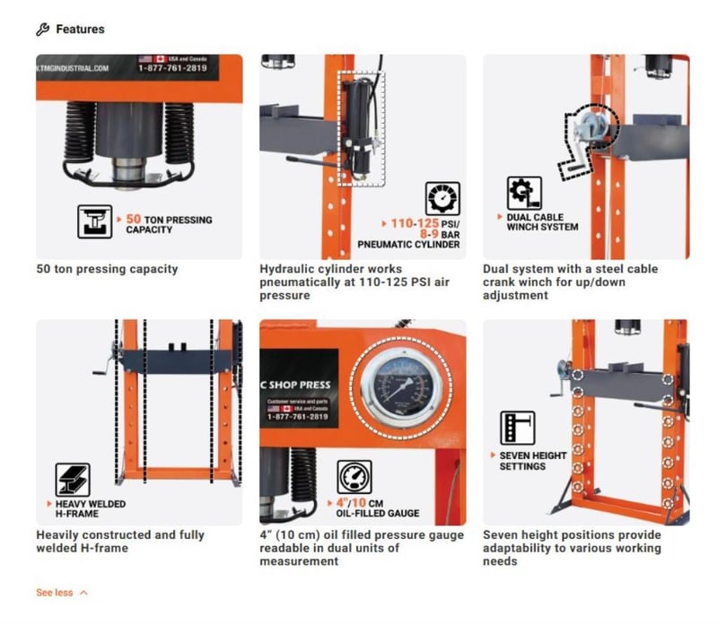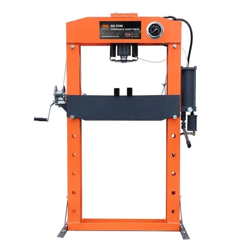 The TMG-SP50 Hydraulic Shop Press is built for those who demand power, precision, and durability in their shop operations. With a high-output 50-ton pressing capacity and dual pneumatic/manual operation, this press is perfect for professionals in automotive, machining, metalworks, fabrication, or assembly. Its robust, fully welded H-frame construction ensures it can handle rigorous tasks like pushing bearings, stamping, bending, and flattening metal with safety and efficiency.