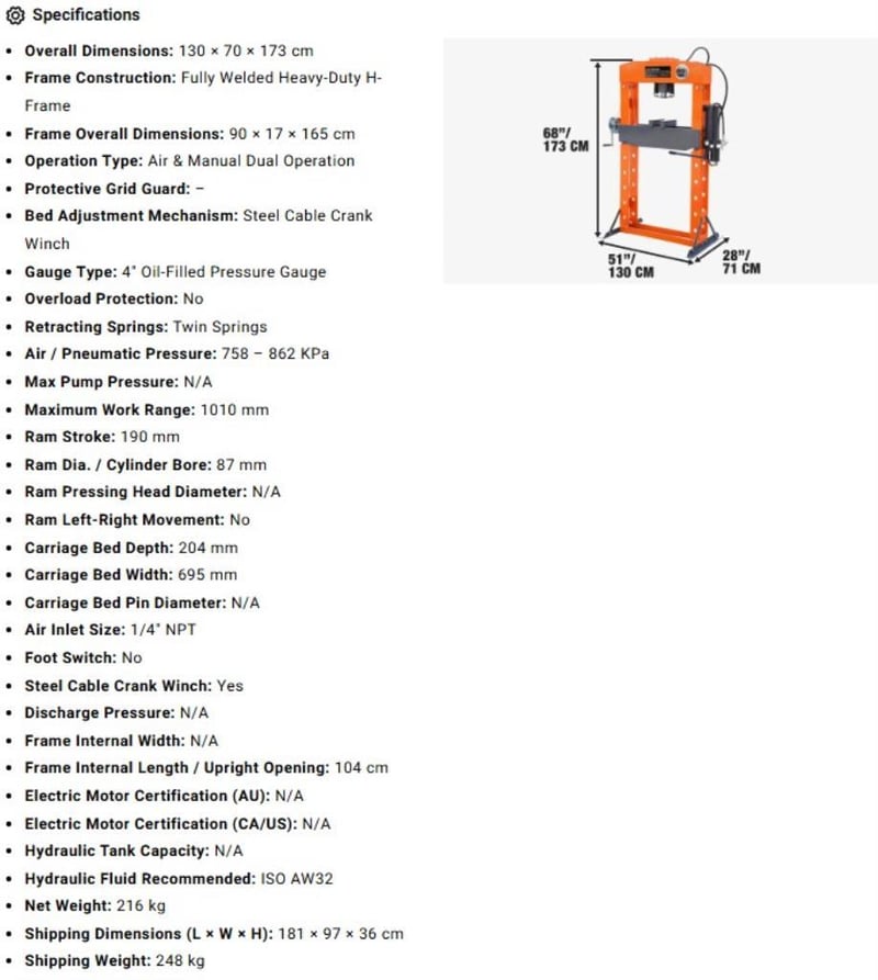WAREHOUSE DIRECT** 50 Ton Hydraulic Shop Press, Air & Manual Dual Operation, TMG-SP50