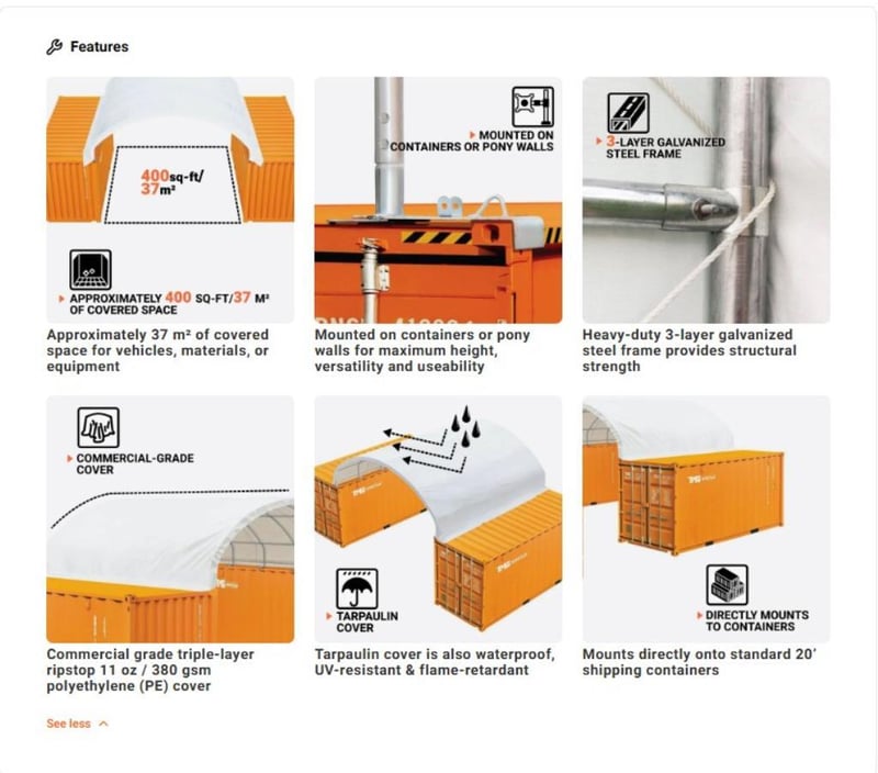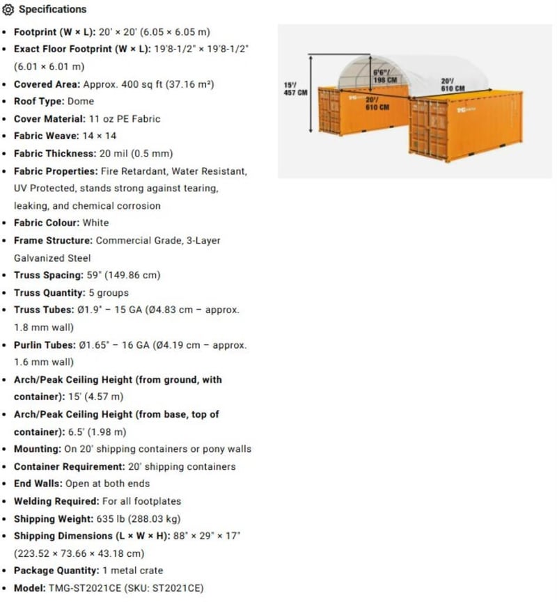 Installation is fast and simple with all bolt-on hardware included, allowing for container mounting with no additional footings required. Whether you need coverage for tools, vehicles, or onsite work, the TMG-ST2021CE is a dependable, cost-effective solution. "