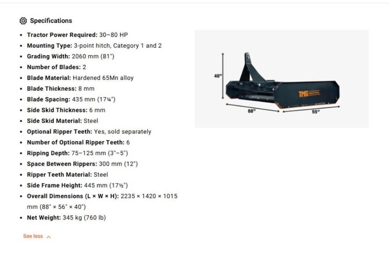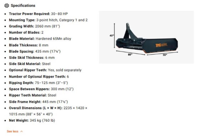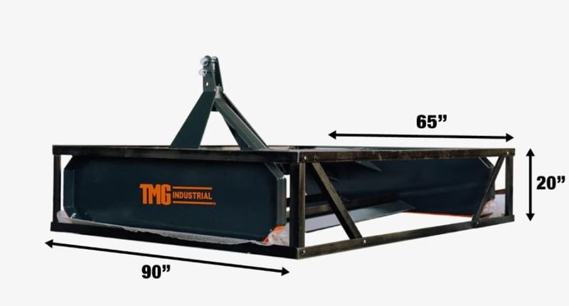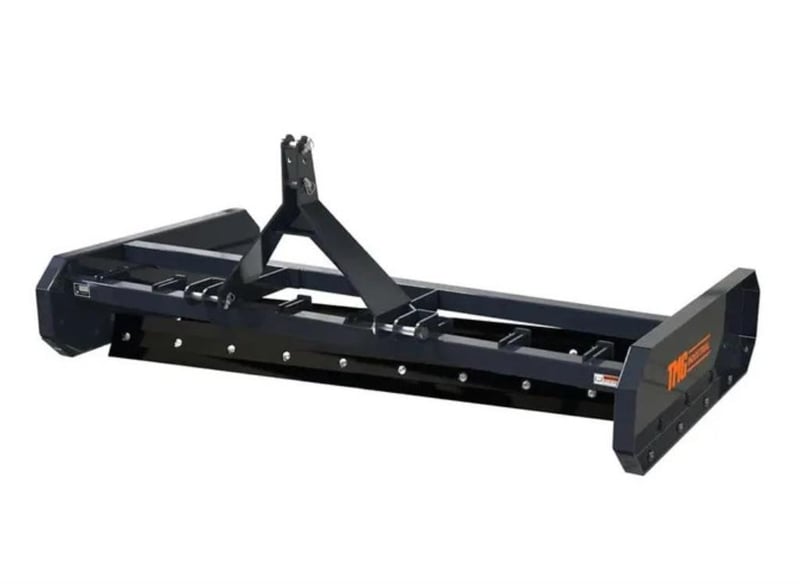 WAREHOUSE DIRECT** 2060 mm Tractor Land Leveler, Dual Blades, 3-Point Hitch, Category 1 & 2 TMG-TLL84 "Product Description The TMG-TLL84 Tractor Land Leveler keeps your gravel or dirt road looking clean, manicured and professional. It smooths out rough terrain and helps resurface old, tired, overridden driveways, range roads and other graveled or dirt covered tracks and pathways. Two replaceable double-edge blades allow you to cover your tire marks while you work leaving only a sleek finish that is easy to drive on and pleasant to look at. Ideal attachment for anybody in the grading and roadworks business. The 2060 mm width enables you to work through larger areas in a quick and efficient manner. Could also be used for landscaping; preparing large yards or other areas for planting and seeding. The precisely engineered pitch angle allows you to cut through any kind of tough ground materials and reprocess workable surfaces with ease. Equipped with a 3-point Category 1 and 2 hitch for easy hookup to your tractor, this is a great addition to any agricultural property owner for keeping roads and driveways smooth and operable. It also has an adjustable depth of 75 - 125 mm to help mitigate wash boarding and fill potholes in heavy traffic areas. "