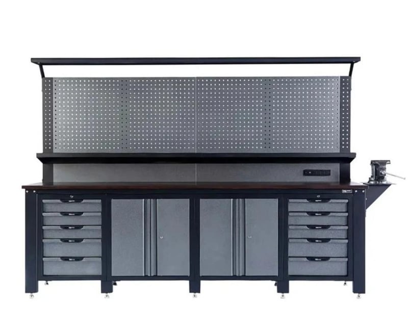 The TMG-WBC10 Commercial Grade Workbench is a robust and highly versatile solution for tool storage and workspace needs in home garages, repair shops, automotive facilities, and industrial environments. Designed with functionality and durability in mind, it offers extensive storage options through a combination of strategically positioned pegboards, lockable slide drawers, and cabinets of various sizes.