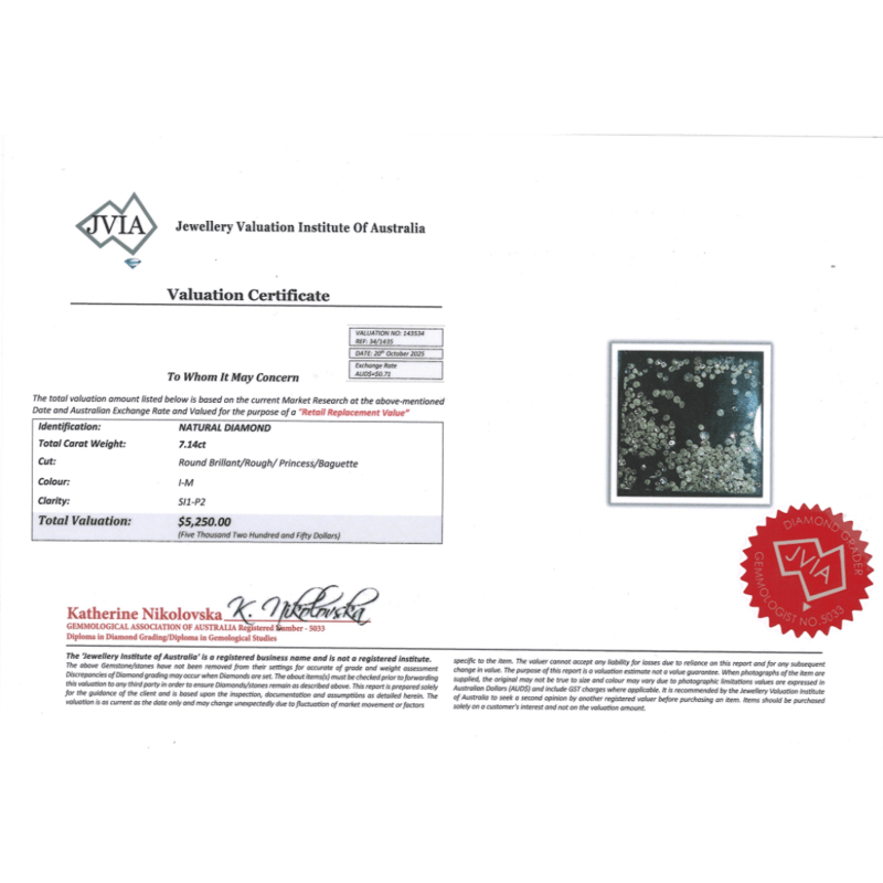 7.14CT TDW, NATURAL DIAMONDS Round Brilliant/Rough/Princess/Baguette Cuts, I-M Colour, Si1-P2 Clarity, Loose, Unset. Valuations Provided by an Independent Third-Party Professional Not Directly Associated With Lloyds Auctions at AUD $$5,250.00This valuation has been conducted by an independent third-party professional. The valuation amount is an assessment by the issuing valuer and does not reflect the auction value of the item. Any inquiries regarding the valuation should be directed to the issuing valuer (refer to contact details on the certificate), as Lloyds Auctions has no affiliation or influence over the valuation, the valuer, or the stated amount. Condition: Good - Refer Images 0645912+2035