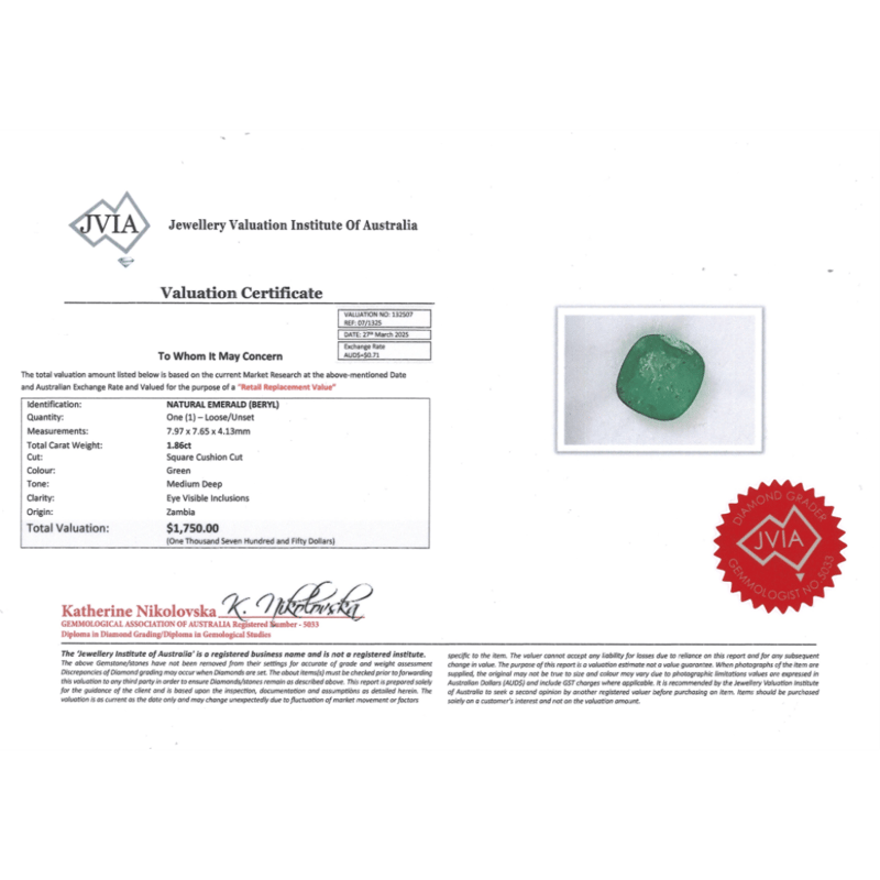 Cushion Cut, Medium Deep Green, Eye Visible Inclusions, Zambian Origin, Loose, Unset.