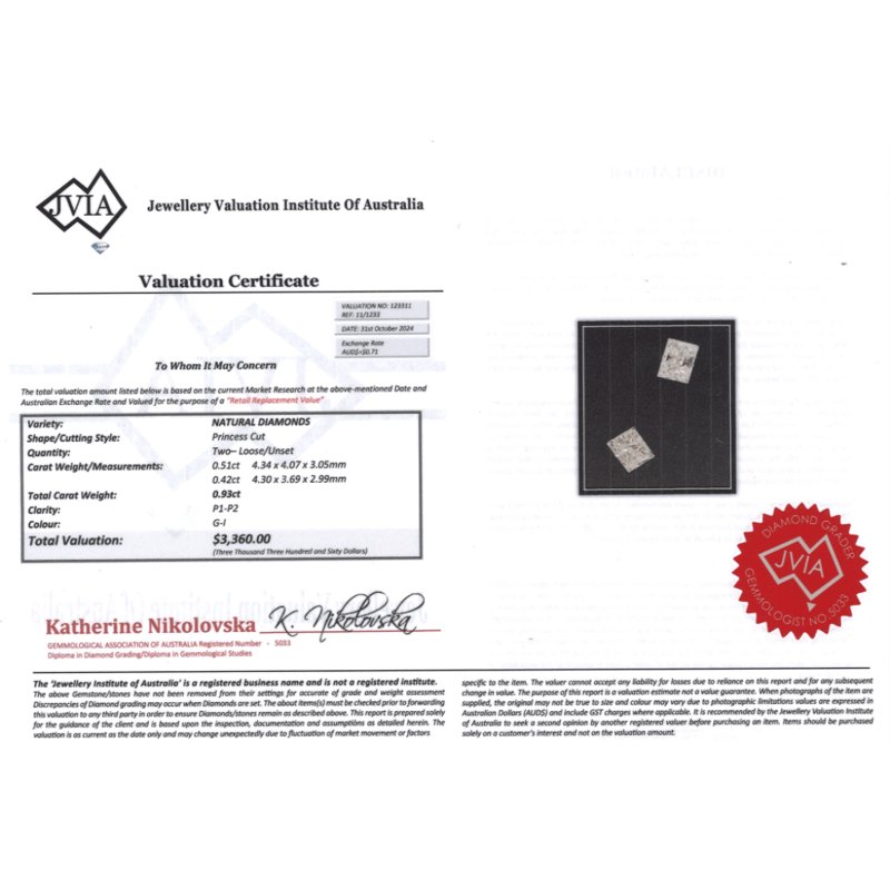 0.93CT TDW X 2, NATURAL DIAMONDS Princess Cut, G-I Colour, P1-P2 Clarity, Loose, Unset. Valuations Provided by an Independent Third-Party Professional Not Directly Associated With Lloyds Auctions at AUD $$3,360.00This valuation has been conducted by an independent third-party professional. The valuation amount is an assessment by the issuing valuer and does not reflect the auction value of the item. Any inquiries regarding the valuation should be directed to the issuing valuer (refer to contact details on the certificate), as Lloyds Auctions has no affiliation or influence over the valuation, the valuer, or the stated amount. Condition: Good - Refer Images 0645912+2060