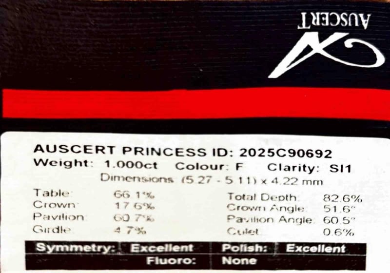 1.00CT PRINCESS NATURAL DIAMOND.F/Si1Accompanied By Auscert Certificate 2025C90692Condition: Good - Refer To ImagesCROSSDOCKED163037+12