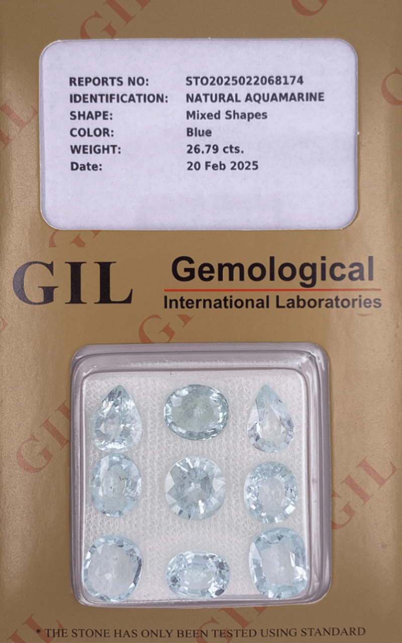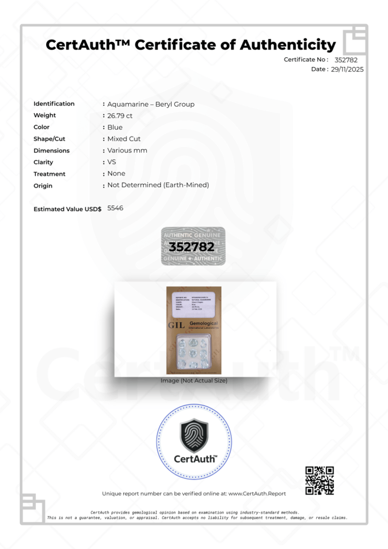 26.79 CT AQUAMARINE PARCEL – BLUE, MIXED CUTS, GIL & CERTAUTH™ A Natural 26.79-Carat Aquamarine Parcel From The Beryl Group, Presented In A Selection Of Mixed Cuts With A Clean Blue Colour. The Gemstones Are Untreated And Are Housed Together In Their Original Gemological International Laboratories (Gil) Case. Accompanied By A Certauth™ Digital Certificate For Secure Online Verification.Details:• Gemstone: Aquamarine (Beryl Group)• Total Carat Weight: 26.79 Ct• Colour: Blue• Cut: Mixed Cut (Multiple Stones)• Dimensions: Various Mm• Clarity: Vs• Treatment: None• Origin: Not Determined (Earth-Mined)• Gil Report No.: Sto2025022068170• Certification: Certauth™ Digital Certificate• Estimated Value: Usd $5,546Note: Loose Gemstone Parcel In Excellent Condition, Securely Housed In Original Gil Laboratory Case And Accompanied By Certauth™ Digital Authentication. Condition: Good - Refer Images 0488440+50
