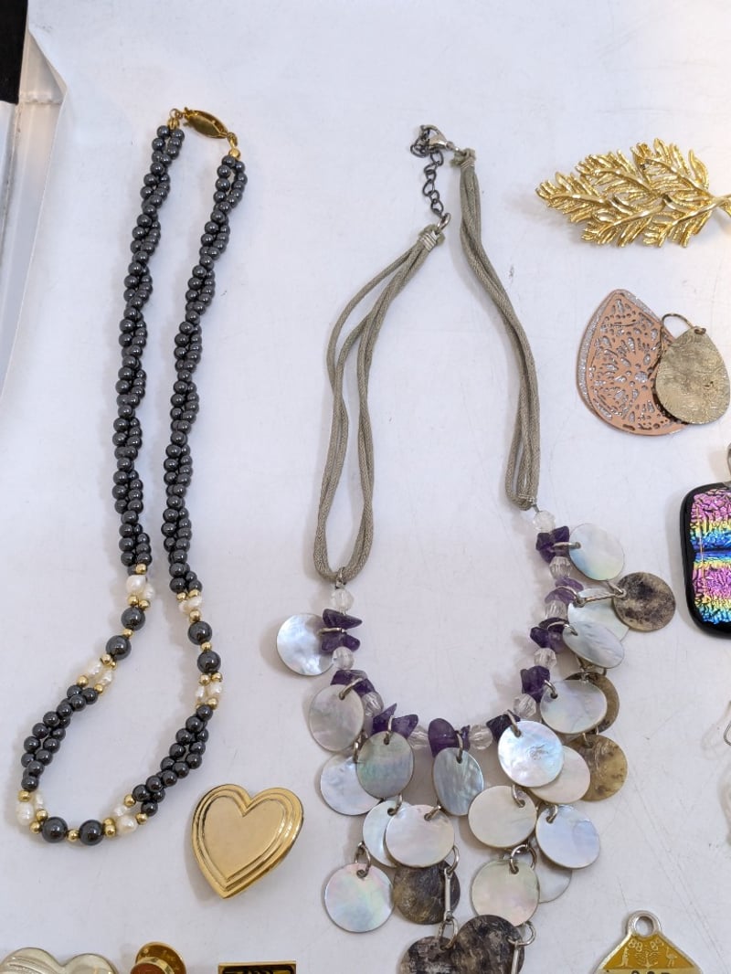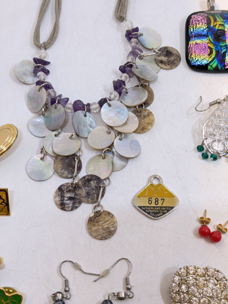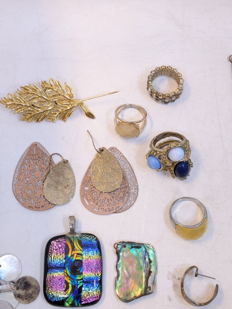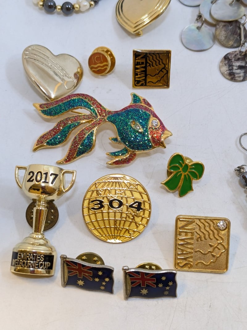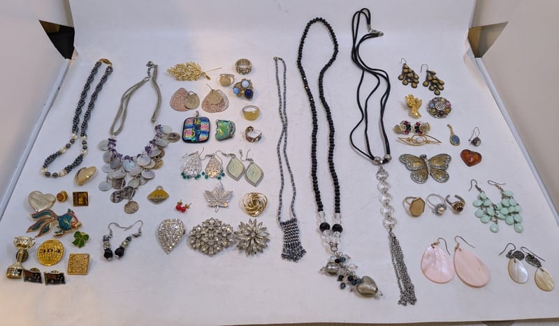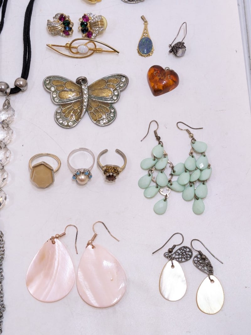 Includes Various Pins And Badges, Beaded Necklaces, Coloured Rings, Opal Necklace Pendants, Etc