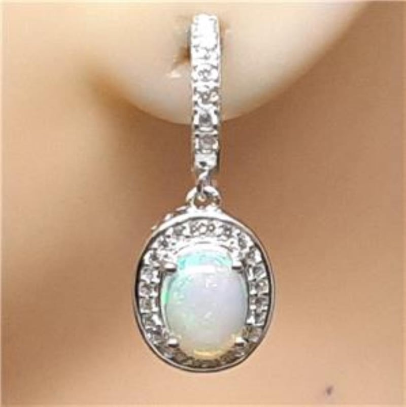 Made In Solid Sterling Silver An Plated In14K White Gold. Features Natura; Oval Cabochon Rainbow Opals Surrounded By Natural White Sapphires. Earrings Measure 25X10Mm