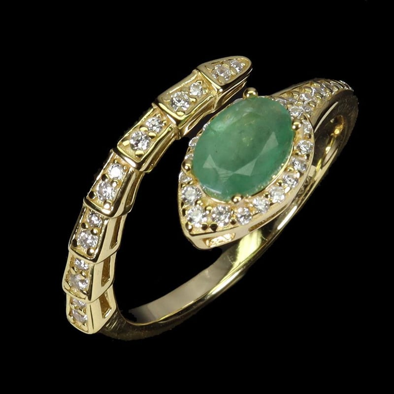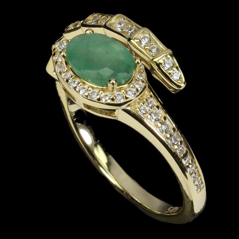 NATURAL EMERALD SERPENT RING. Made In Solid Sterling Silver And Plated In 14K Yellow Gold. Features Natural Green Emerald And Sparkling Czs. Ring Size 8 Condition: Good - Refer Images 0488448+1