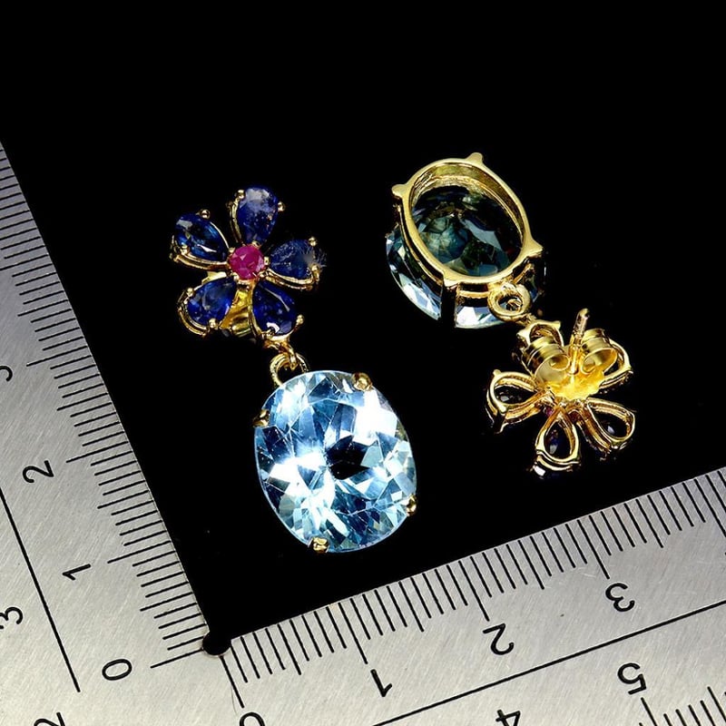 NATURAL RUBY SAPPHIRE & TOPAZ EARRINGS Made In Solid Sterling Silver And Plated In 14K Yellow Gold. Features Natural Midnight Blue Sapphires, Red Rubies And Sky Blue Topaz. Earrings Measure 29X12Mm Condition: Good - Refer Images 0488448+8