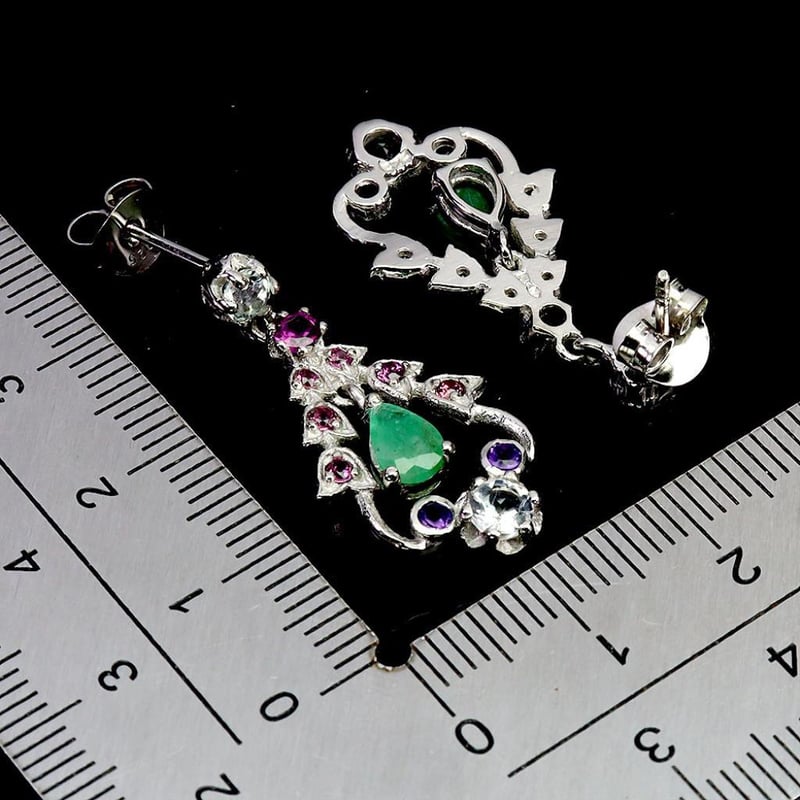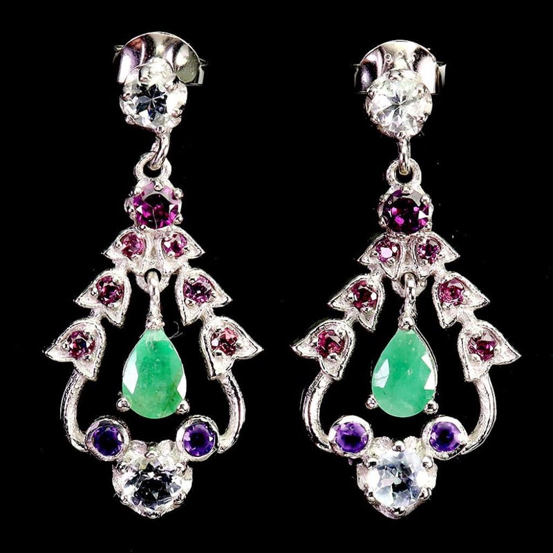 Made In Solid Sterling Silver And Plated In14K White Gold. Features All Natural Emerald Aquamarine & Garnet. Earrings Measure 30X15Mm