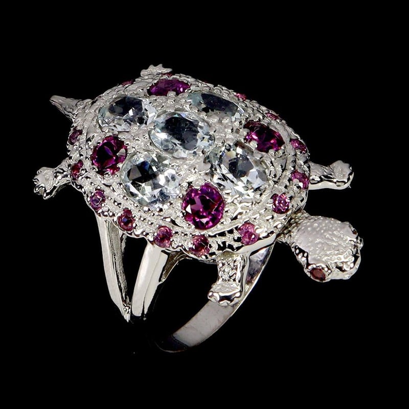NATURAL AQUAMARINE & GARNET TURTLE RING.