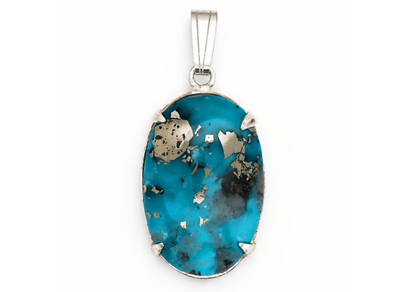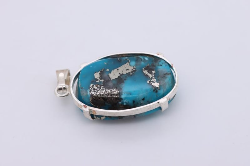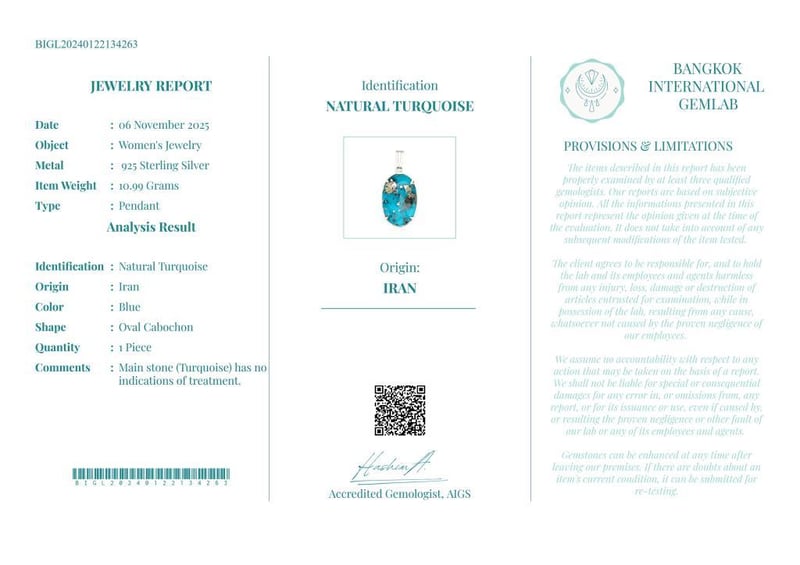 NATURAL MOHAVE TURQUOISE PENDANT ON 925 SILVER - WITH CERTIFICATE Gemstone : Natural Mohave TurquoiseCertificate Number : Bigl20240122134263Item Total Weight : 10.99 GramsGemstone Color : BlueShape : Oval CabochonMeasurement/Size : N/AComments : Main Stone (Turquoise) Has No Indications Of Treatment. ✻ Verify Report Online At Www.Bangkokinternationalgemlab.Co Condition: Good - Refer Images 01611171+34