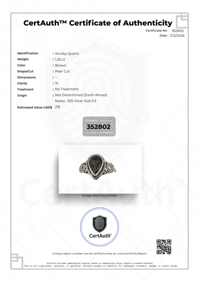 This Natural Smoky Quartz Displays A Rich Brown Colour And Is Fashioned Into A Pear Cut. Weighing 1.25 Ct With Si Clarity, This Earth-Mined Gemstone Has Received No Treatment. The Piece Is Set In 925 Silver, Ring Size 5.5, And Is Supplied With A Certauth Digital Certificate For Secure Online Verification.