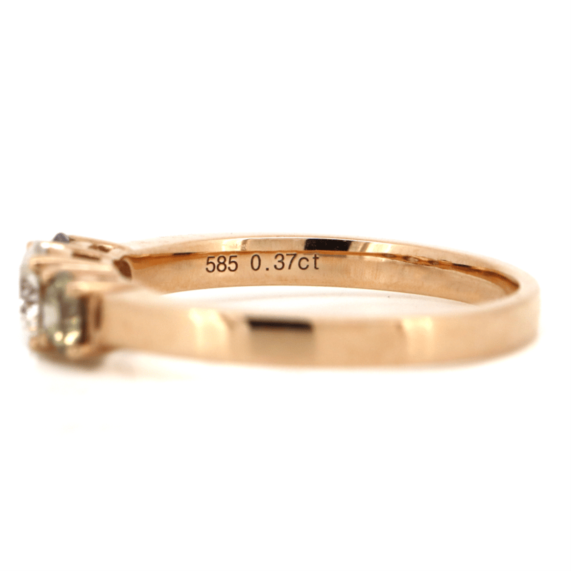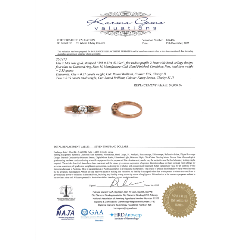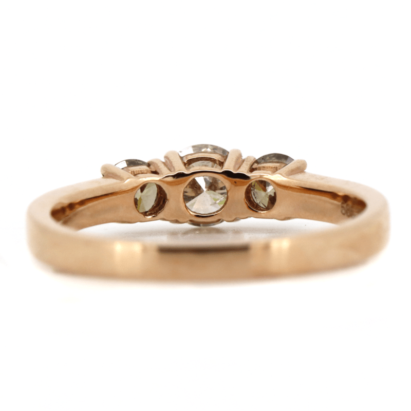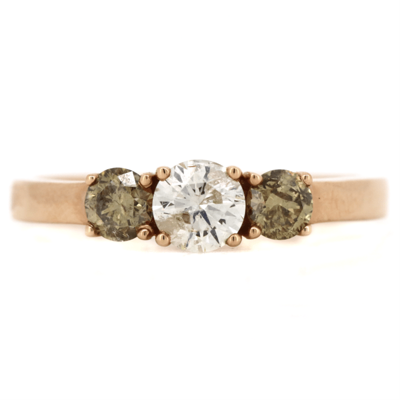 The Centre Features, One Round Brilliant Cut, Diamond (0.37Ct, F-G Colour, I1 Clarity), Claw Set. Flanking Each Side Of The Centre Are, 2 Round Brilliant Cut, Brown Diamonds (0.39Ct Tdw, Si-I1 Clarity), 4 Claw Set. Ring Size M.