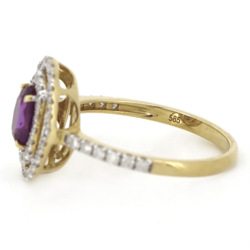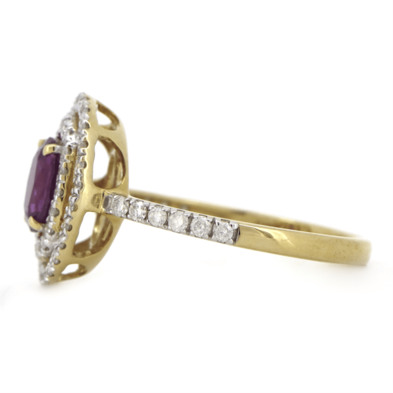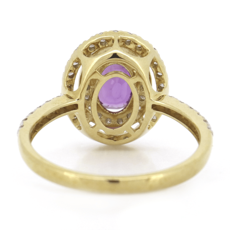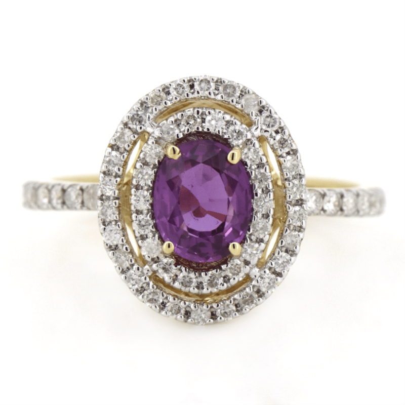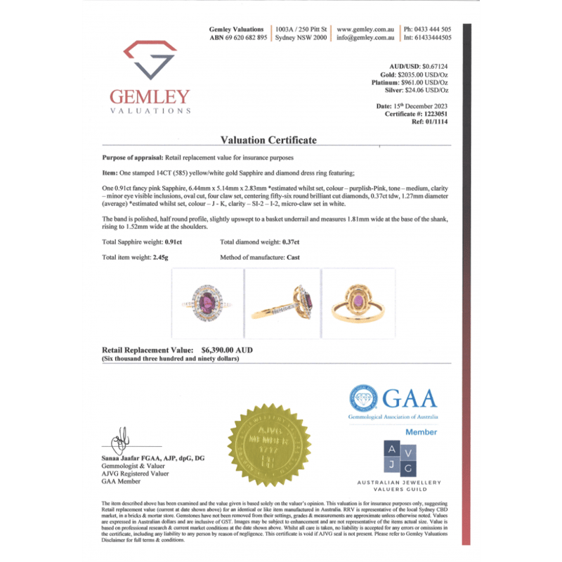 14K YELLOW/WHITE GOLD, PINK SAPPHIRE AND DIAMOND, DOUBLE HALO RING. The Centre Features, One Oval Cut, Purplish-Pink, Sapphire (0.91Ct, Minor Eye Visible Inclusions), 4 Claw Set. Surrounding The Centre In A Double Halo And Decorating The Band Are, 56 Round Brilliant Cut, Diamonds (0.37Ct Tdw, J-K Colour, Si2-I2 Clarity), Micro-Claw Set In White Gold. Ring Size M 1/2. Valuations Provided by an Independent Third-Party Professional Not Directly Associated With Lloyds Auctions at AUD $$6,390.00This valuation has been conducted by an independent third-party professional. The valuation amount is an assessment by the issuing valuer and does not reflect the auction value of the item. Any inquiries regarding the valuation should be directed to the issuing valuer (refer to contact details on the certificate), as Lloyds Auctions has no affiliation or influence over the valuation, the valuer, or the stated amount. Condition: Good - Refer Images 0645919+1405
