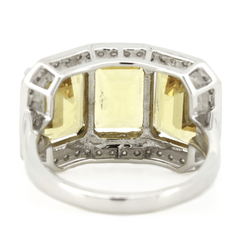 14K WHITE GOLD, HELIODOR AND DIAMOND, HALO TRILOGY RING. The Central Design Features, 3 Emerald Cut, Medium Light Brownish-Yellow, Heliodors (6.20Ct Tsw, Minor Eye Visible Inclusions), Claw Set. Surrounding The Centre Are, 44 Round Brilliant Cut, Diamonds (0.35Ct Tdw, J-K Colour, Si2-I2 Clarity), Bead Set. Ring Size M. Valuations Provided by an Independent Third-Party Professional Not Directly Associated With Lloyds Auctions at AUD $$11,790.00This valuation has been conducted by an independent third-party professional. The valuation amount is an assessment by the issuing valuer and does not reflect the auction value of the item. Any inquiries regarding the valuation should be directed to the issuing valuer (refer to contact details on the certificate), as Lloyds Auctions has no affiliation or influence over the valuation, the valuer, or the stated amount. Condition: Good - Refer Images 0645919+1407