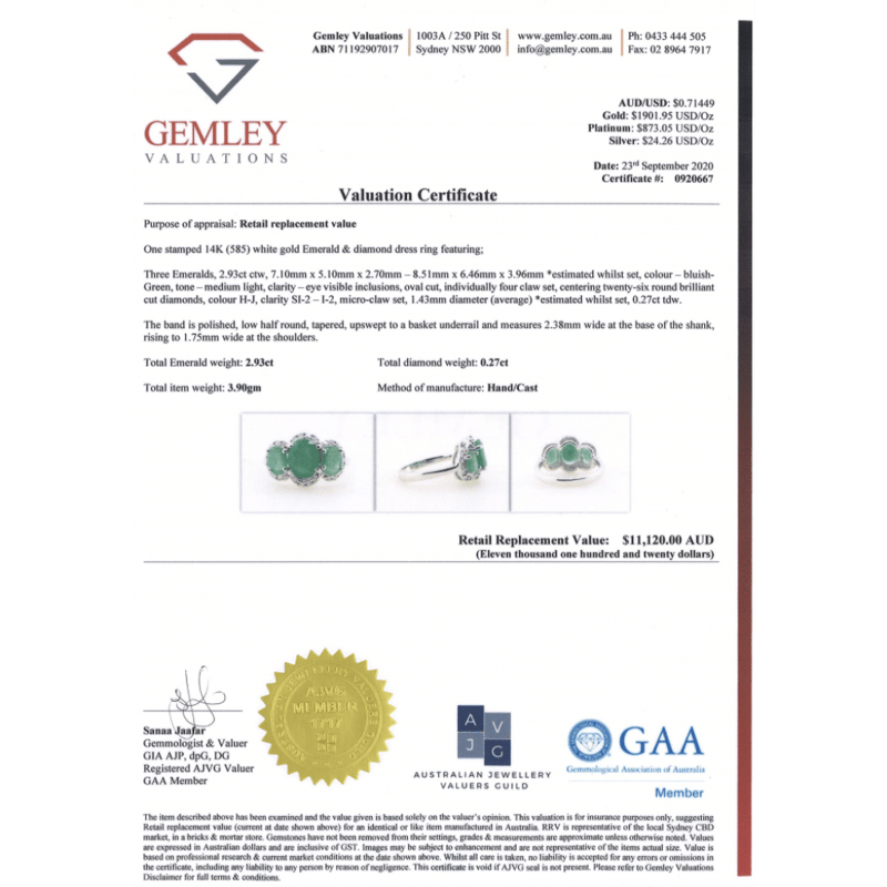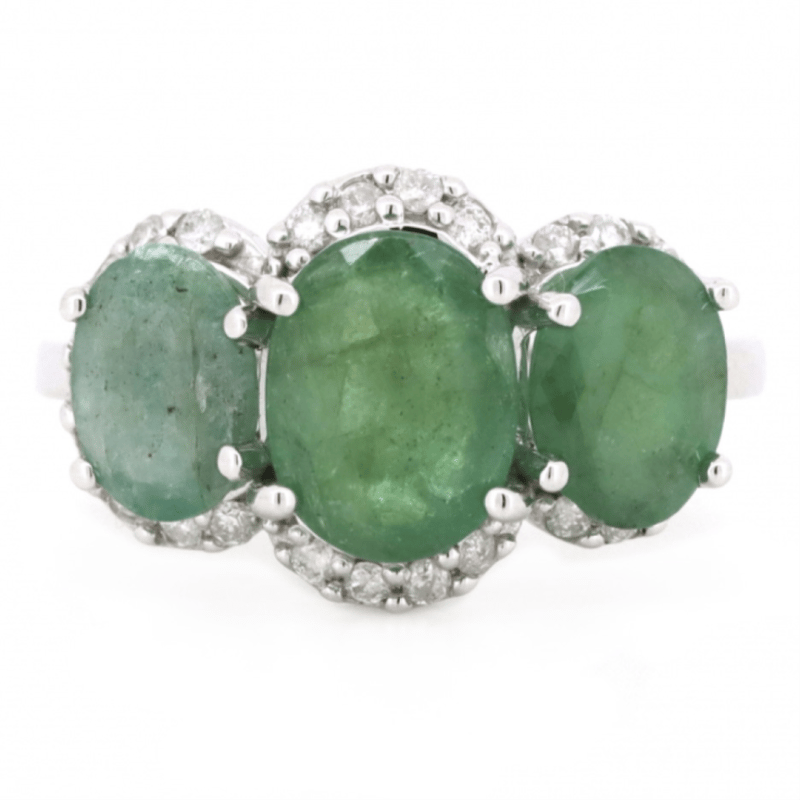 The Centre Features, 3 Oval Cut, Medium Light Bluish-Green, Emeralds (2.93Ct Tsw, Eye Visible Inclusions), Claw Set. Encompassing The Stones Are, 26 Round Brilliant Cut, Diamonds (0.27Ct Tdw, H-J Colour, Si2-I2 Clarity), Micro-Claw Set. Ring Size L.