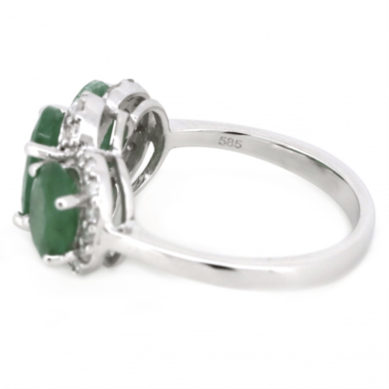 14K WHITE GOLD, EMERALD AND DIAMOND, HALO TRILOGY RING.