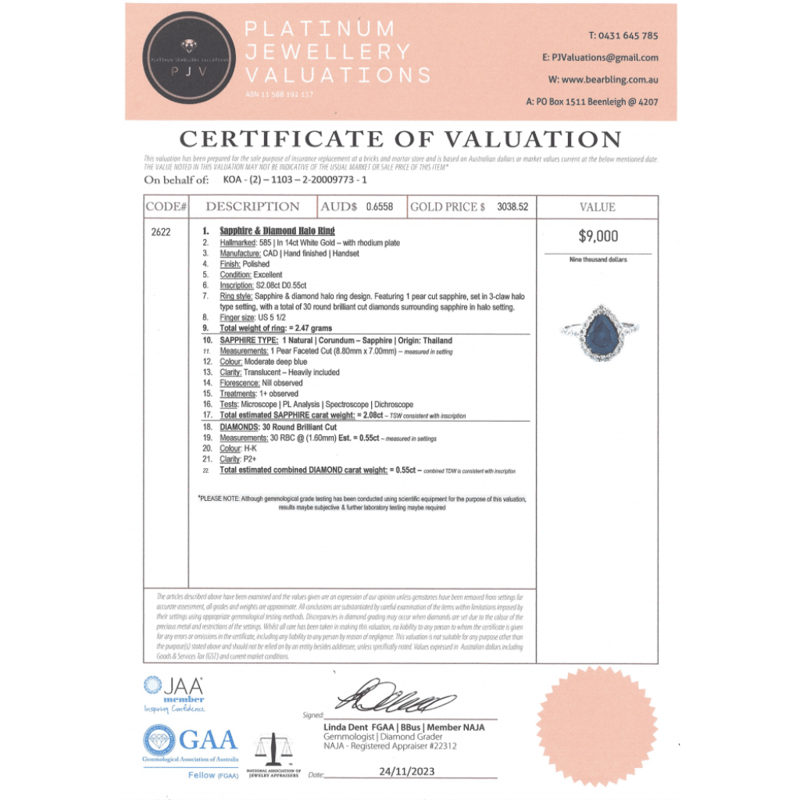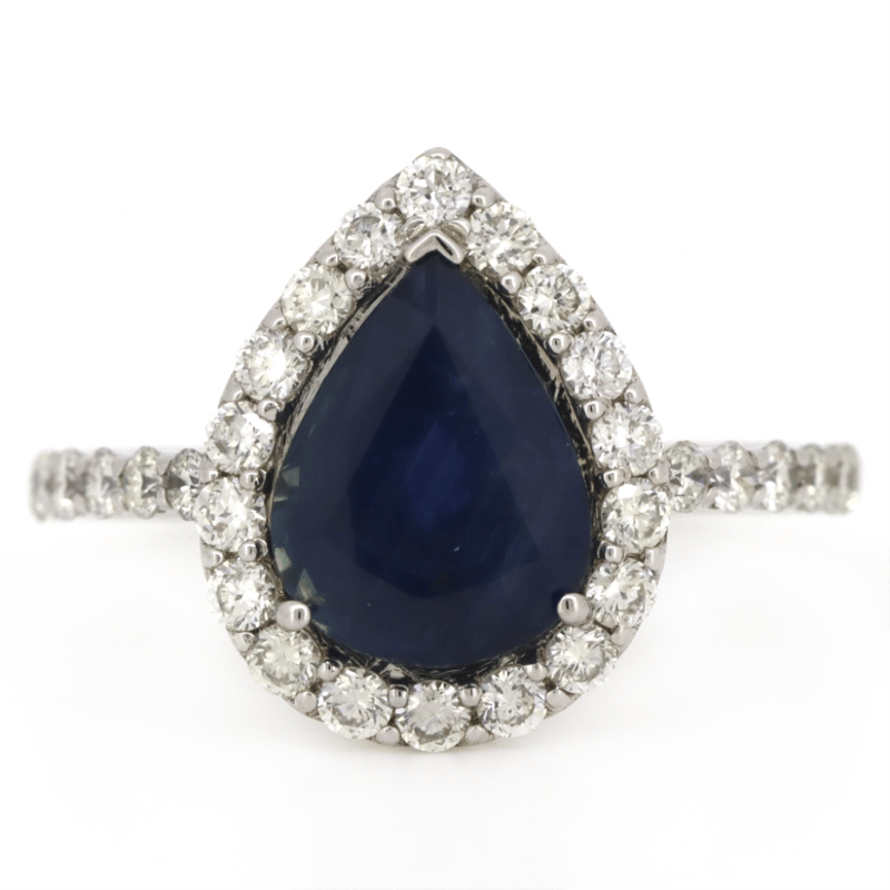 The Centre Features, One Pear Faceted Cut, Moderate Deep Blue, Sapphire (2.08Ct, Heavily Included, Enhanced), Claw Set. Encompassing The Design Features, 30 Round Brilliant Cut, Diamonds (0.55Ct Tdw, H-K Colour, P2+ Clarity), Bead Set. Ring Size K.