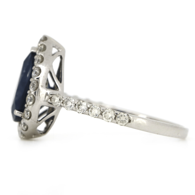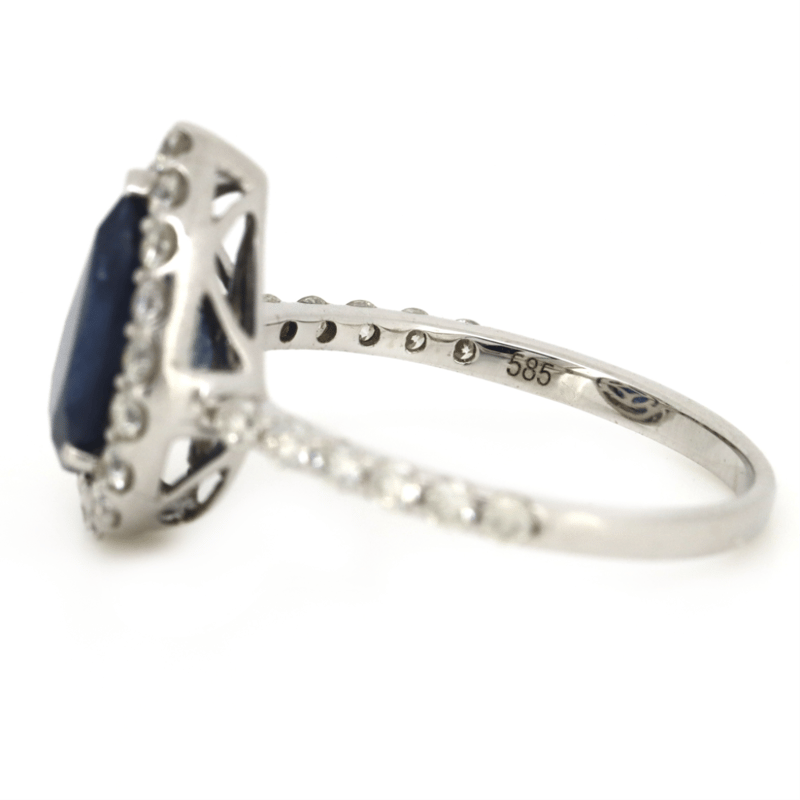 14K WHITE GOLD, BLUE SAPPHIRE AND DIAMOND, HALO RING.
