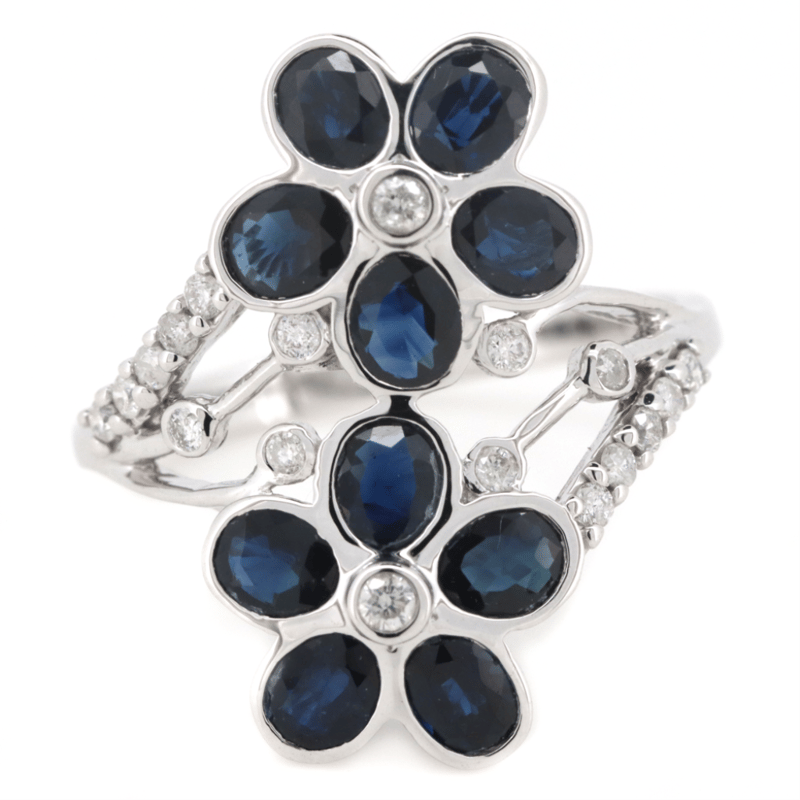 The Flower Petals Are, 10 Oval Cut, Dark Royal Blue, Sapphires (2.00Ct Tsw, Included), Bezel Set. Centering The Flowers Are Decorating The Design Are, 18 Round Brilliant Cut, Diamonds (0.18Ct Tdw, J-K Colour, Si2-I2 Clarity), Bead/Bezel Set. Ring Size K 1/2.