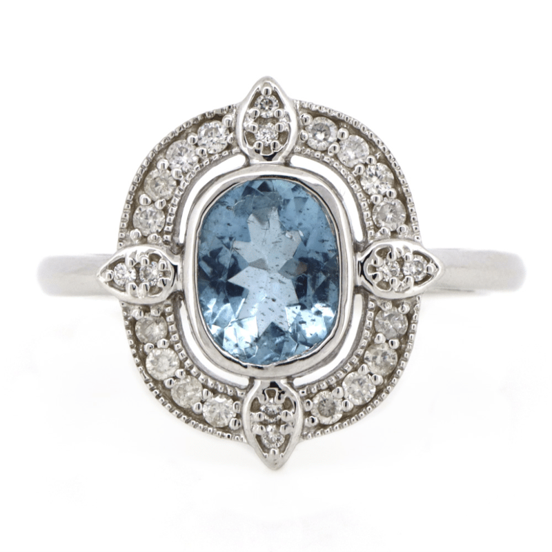 The Centre Features, One Oval Faceted Cut, Medium Blue, Aquamarine (1.04Ct, Natural Inclusions), Bezel Set. Surrounded By, 24 Round Brilliant Cut, Diamonds (0.21Ct Tdw, H-J Colour, Si-I1 Clarity), Bead Set. Ring Size O.