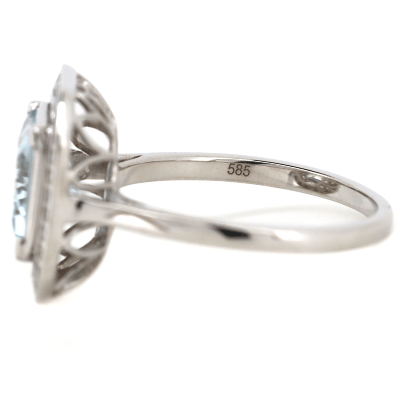 14K WHITE GOLD, AQUAMARINE AND DIAMOND, HALO RING.