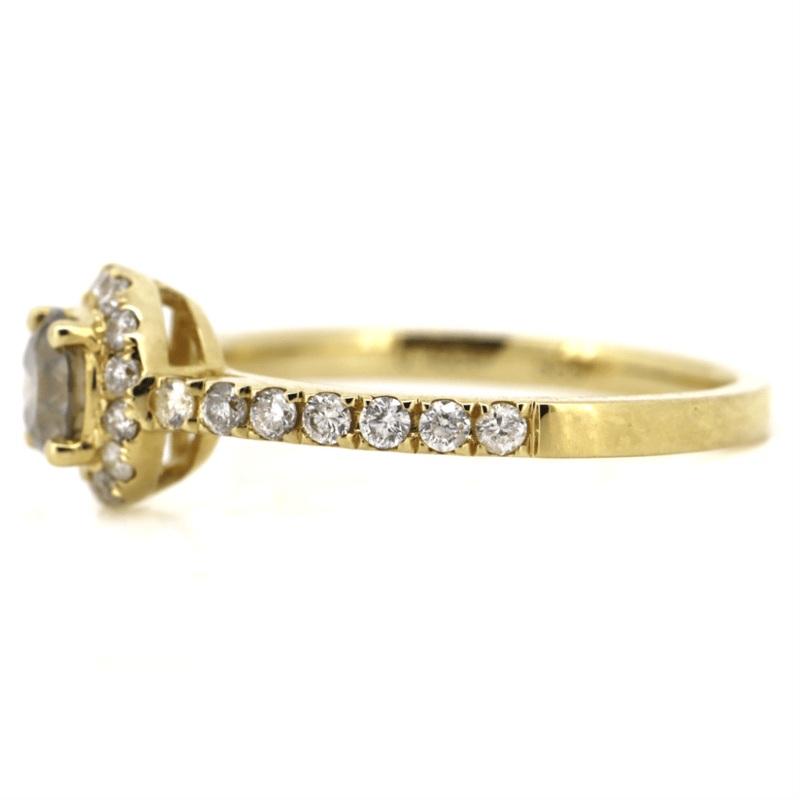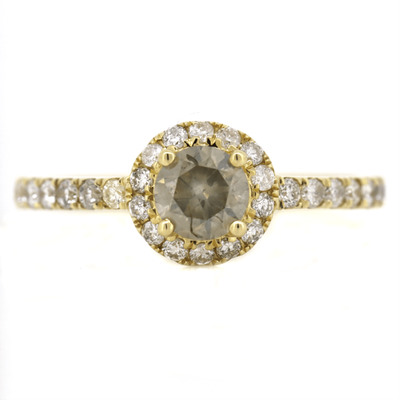 The Centre Features, One Round Brilliant Cut, Greyish-Brown, Diamond (0.45Ct, I1 Clarity), 4 Claw Set. Surrounding The Centre In A Halo And Decorating The Band Are, 29 Round Brilliant Cut, Diamonds (0.35Ct Tdw, H-K Colour, Si-I2 Clarity), Bead Set. Ring Size L 1/2.