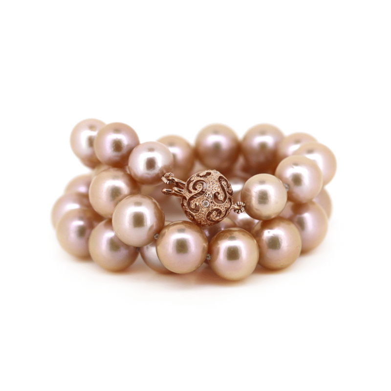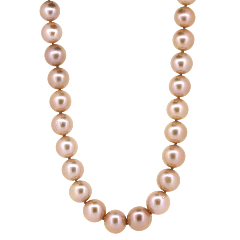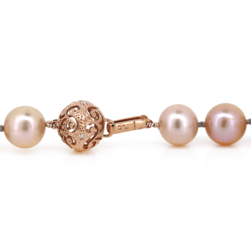 The Necklace Features, 37 Near Round, Pink With Silver And Gold Overtones, Cultured South Sea Pearls (10.00Mm-12.80Mm Size, Good Lustre, Moderate Growth Blemishes). Embellishing The 14K Rose Gold Filigree Ball Clasp Are, 4 Round Brilliant Cut, Diamonds (0.05Ct Tdw, I-J Colour, Si-I2 Clarity), Bead Set. Necklace Length Is 44.5Cm.