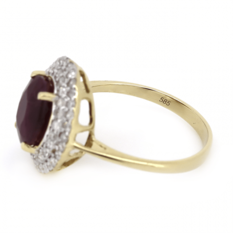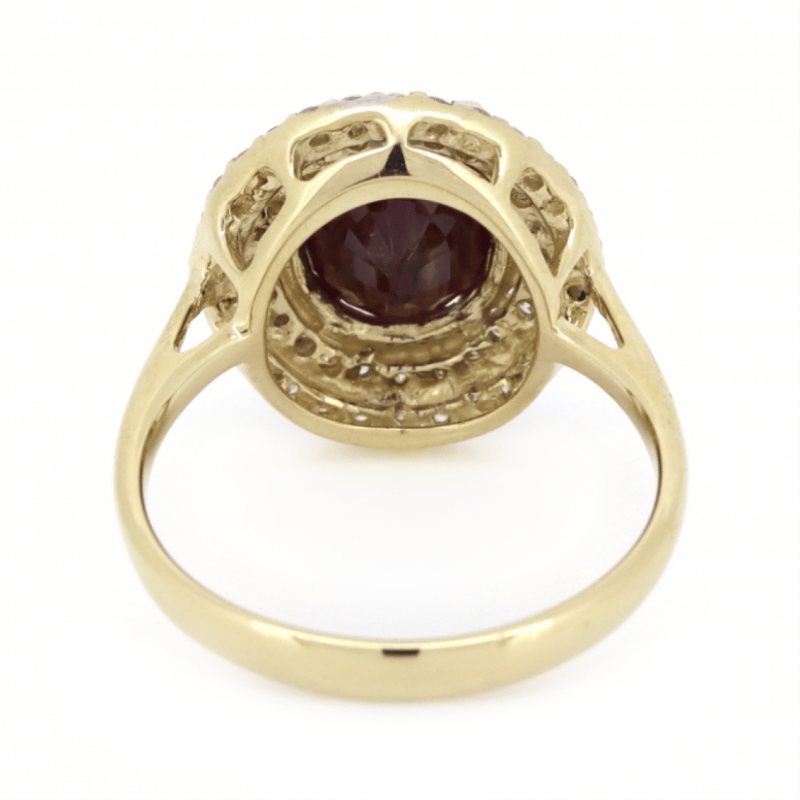 14K YELLOW GOLD, RUBY AND DIAMOND, DOUBLE HALO RING.