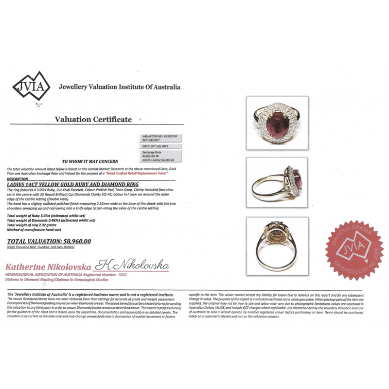 The Centre Features, One Oval Faceted Cut, Deep Pinkish-Red, Ruby (3.07Ct, Included), 4 Claw Set. Surrounding The Centre In A Double Halo Are, 55 Round Brilliant Cut, Diamonds (0.48Ct Tdw, H-J Colour, Si2-P2 Clarity), Claw Set. Ring Size L 1/2.