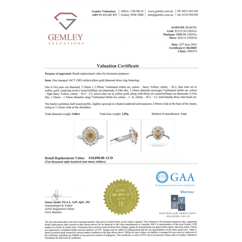 14K WHITE GOLD, FANCY YELLOW DIAMOND, ART DECO INSPIRED RING. The Centre Features, One Pear Cut, Fancy Yellow, (0.14Ct, P1 Clarity), Claw Set. Surrounding The Centre In The Inner Halo Are, 12 Round Brilliant Cut, Fancy Yellow, Diamonds (0.28Ct Tdw, Si2-P2 Clarity), Claw Set. Surrounding The Centre In The Outer Halo And Decorating The Band Are, 35 Round Brilliant Cut, Diamonds (0.35Ct Tdw, I-K Colour, Si2-P2 Clarity), Claw Set. Ring Size N 1/2. Valuations Provided by an Independent Third-Party Professional Not Directly Associated With Lloyds Auctions at AUD $$10,890.00This valuation has been conducted by an independent third-party professional. The valuation amount is an assessment by the issuing valuer and does not reflect the auction value of the item. Any inquiries regarding the valuation should be directed to the issuing valuer (refer to contact details on the certificate), as Lloyds Auctions has no affiliation or influence over the valuation, the valuer, or the stated amount. Condition: Good - Refer Images 0645919+1422