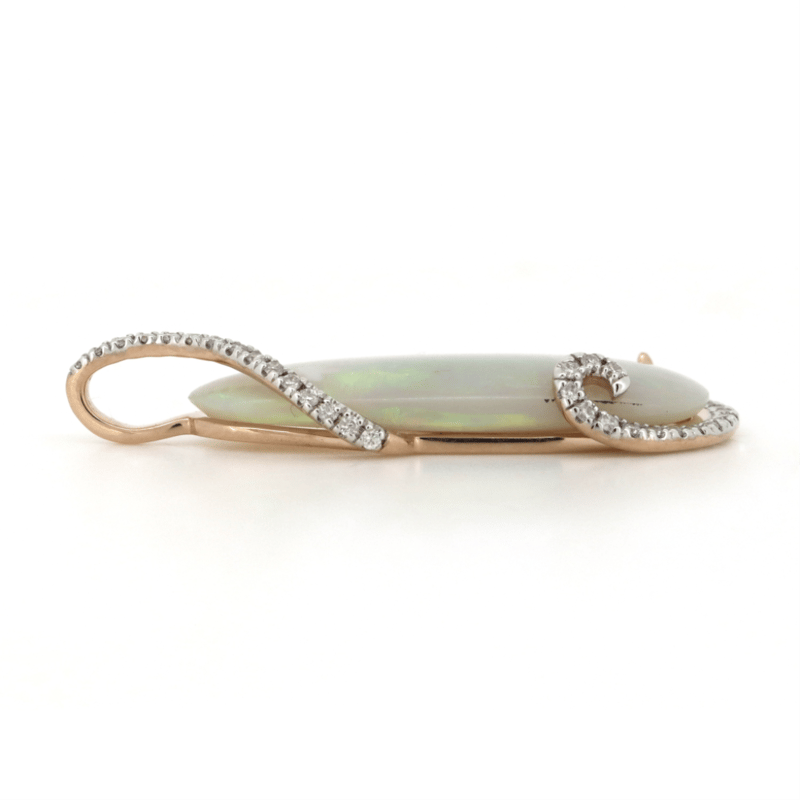 14K ROSE GOLD, 4.83CT COOBER PEDY OPAL AND DIAMOND, DECORATIVE SWIRL PENDANT. The Centre Features, One Cabochon Cut, Flashes Of Red, Yellow, Orange, Purple, Green, Blue, Coober Pedy Opal (4.83Ct), Claw Set. Surrounding The Centre Are, 35 Round Brilliant Cut, Diamonds (0.16Ct Tdw, G-I Colour, Si Clarity), Micro-Bead Set. Valuations Provided by an Independent Third-Party Professional Not Directly Associated With Lloyds Auctions at AUD $$10,500.00This valuation has been conducted by an independent third-party professional. The valuation amount is an assessment by the issuing valuer and does not reflect the auction value of the item. Any inquiries regarding the valuation should be directed to the issuing valuer (refer to contact details on the certificate), as Lloyds Auctions has no affiliation or influence over the valuation, the valuer, or the stated amount. Condition: Good - Refer Images 0645919+1425