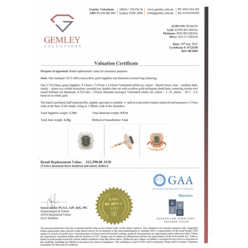 The Centre Features, One Emerald Cut, Medium Dark Bluish-Green, Sapphire (2.75Ct, Minor Eye Visible Inclusions), Double 4 Claw Set In Rose Gold With Millegrain Detail In Yellow Gold. Surrounding The Centre In A Halo Are, 22 Round Brilliant Cut, Diamonds (0.57Ct Tdw, J-K Colour, Si2-I2 Clarity), Bead Set In White Gold. Ring Size P.