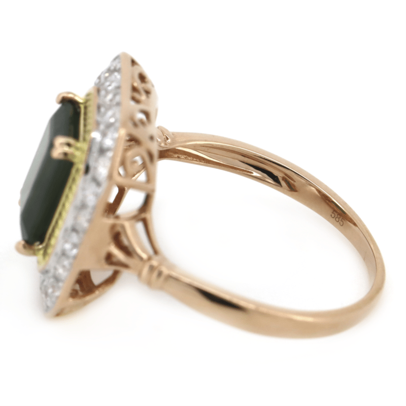 14K ROSE/YELLOW GOLD, GREEN SAPPHIRE AND DIAMOND, HALO RING.