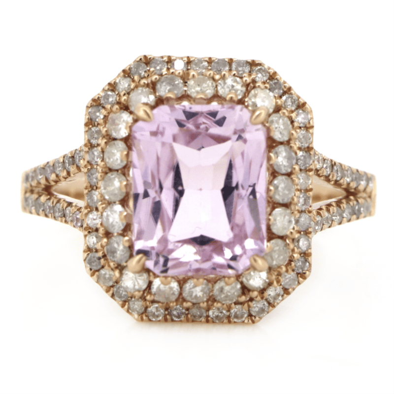 14K ROSE GOLD, KUNZITE AND DIAMOND, DOUBLE HALO SPLIT BAND RING. The Centre Features, One Emerald Cut, Light Pinkish-Purple, Kunzite (3.04Ct, Eye Clean Clarity), Claw Set. Surrounding The Centre In A Double Halo And Decorating The Band Are, 90 Round Brilliant Cut, Diamonds (0.60Ct Tdw, J-K Colour, Si2-I2 Clarity), Micro-Claw Set. Ring Size M 1/2. Valuations Provided by an Independent Third-Party Professional Not Directly Associated With Lloyds Auctions at AUD $$7,690.00This valuation has been conducted by an independent third-party professional. The valuation amount is an assessment by the issuing valuer and does not reflect the auction value of the item. Any inquiries regarding the valuation should be directed to the issuing valuer (refer to contact details on the certificate), as Lloyds Auctions has no affiliation or influence over the valuation, the valuer, or the stated amount. Condition: Good - Refer Images 0645919+1433