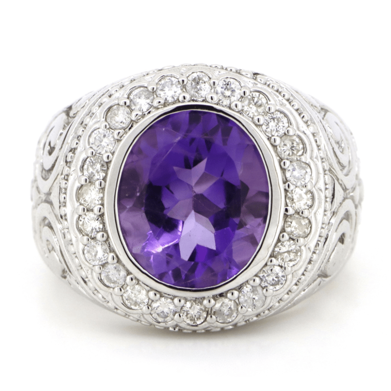 The Centre Features, One Oval Cut, Medium Purple, Amethyst (4.14Ct, Eye Clean Clarity), Bezel Set. Surrounding The Centre In A Halo Are, 24 Round Brilliant Cut, Diamonds (0.53Ct Tdw, H-I Colour, Si1-I2 Clarity), Bead Set. Ring Size P 1/2.