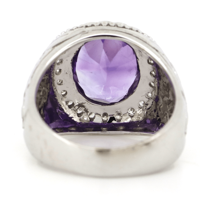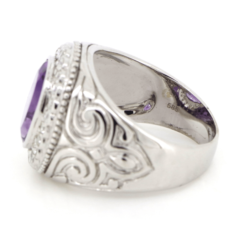 14K WHITE GOLD, AMETHYST AND DIAMOND, DRESS RING.