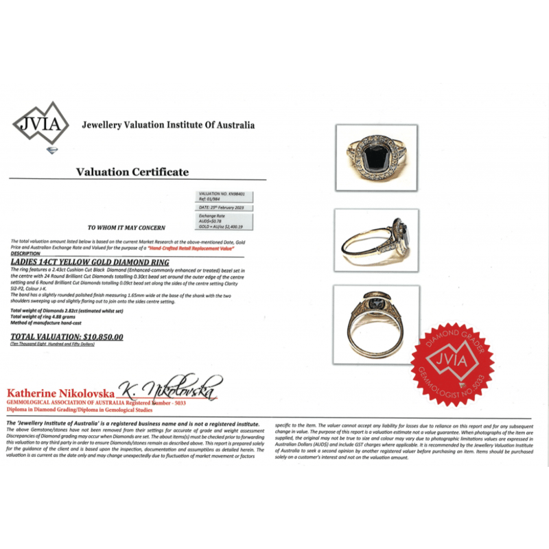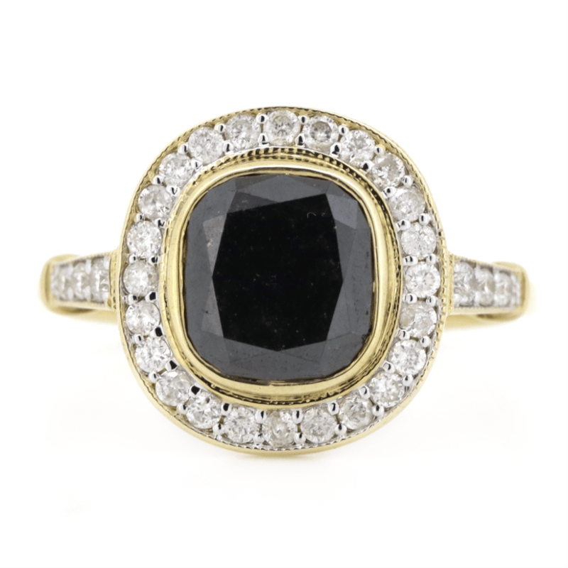 The Centre Features, One Cushion Cut, Black, Diamond (2.43Ct, Enhanced, Opaque), Bezel Set. Surrounding The Centre In A Halo And Decorating The Shoulders Are, 30 Round Brilliant Cut, Diamonds (0.39Ct Tdw, J-K Colour, Si2-P2 Clarity), Bead Set. Ring Size O.
