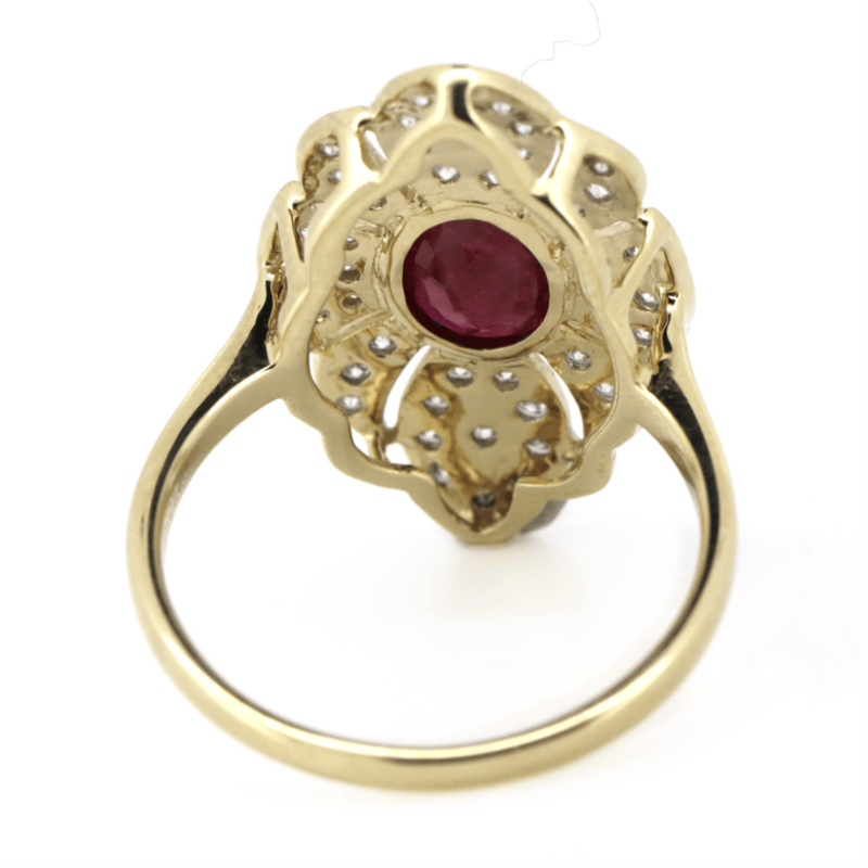 The Centre Features, One Oval Faceted Cut, Deep Red Burmese Ruby (1.40Ct, Slightly Included- Clarity), Bezel Set. Decorating The Setting Are, 44 Round Brilliant Cut, Diamonds (0.46Ct Tdw, G-H Colour, Si1-Si2 Clarity), Bead Set In White Gold. Ring Size Q.