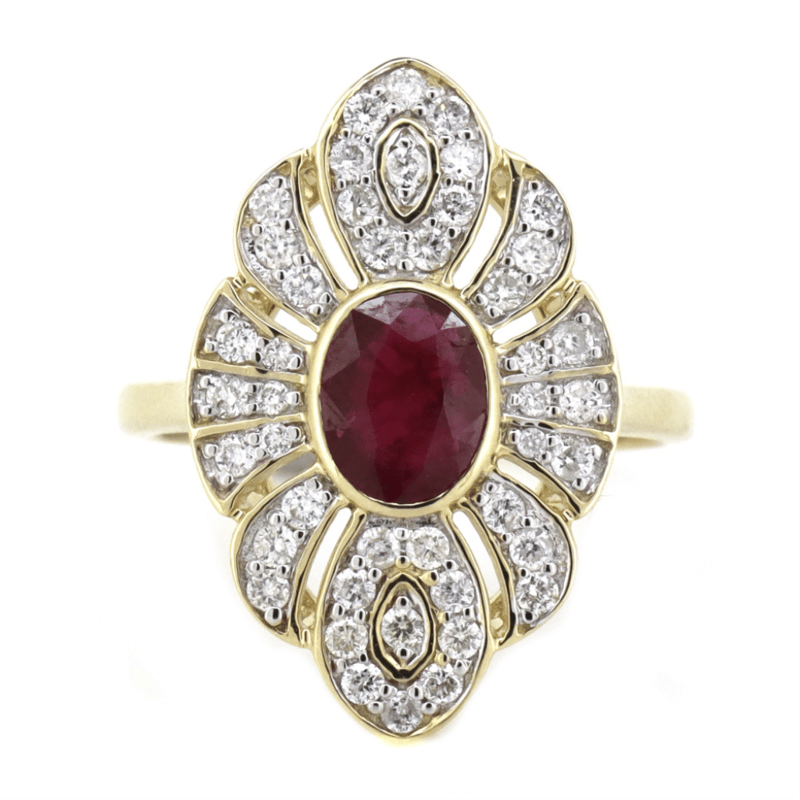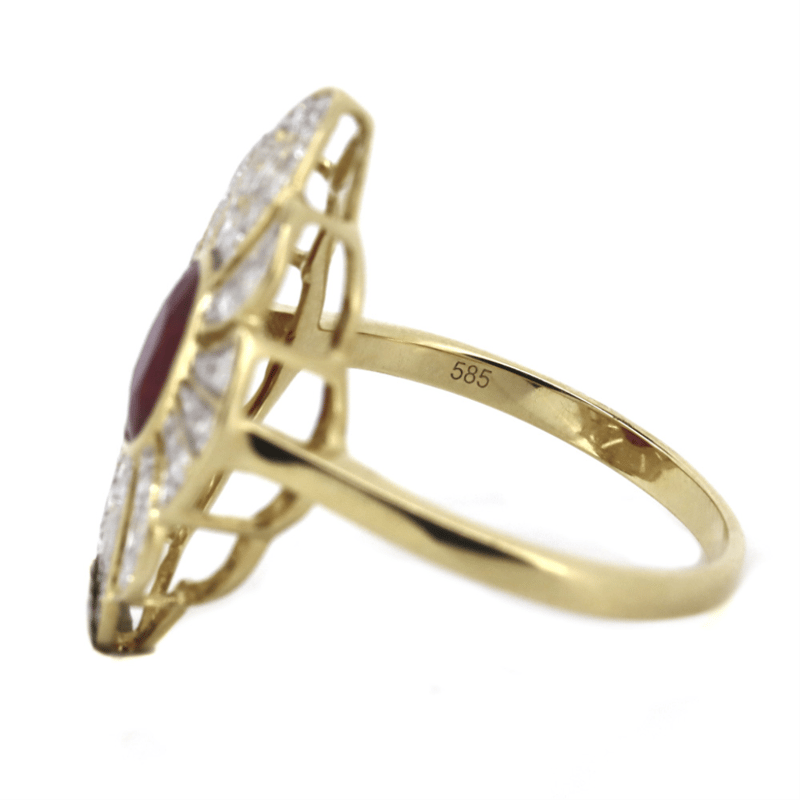 14K YELLOW GOLD, BURMESE RUBY AND DIAMOND, STATEMENT RING.